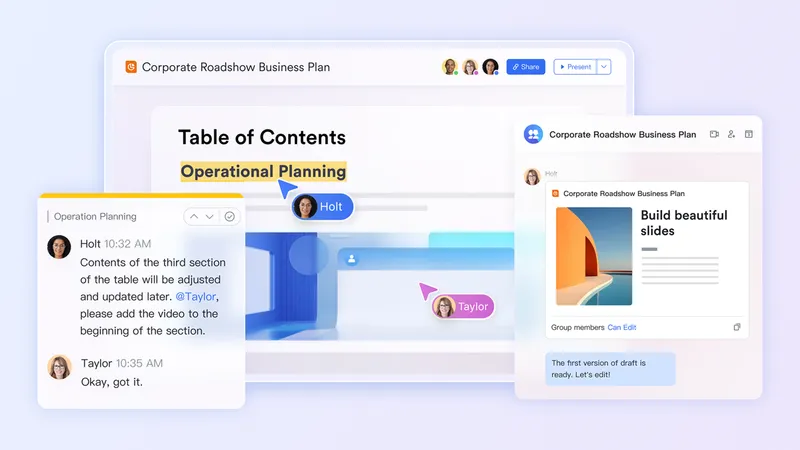 - Real-time co-editing with full contributor visibility. Up to 200 people can edit the same document at the same time, with each contributor's cursor visible to all active editors. Documents that require cross-functional input get built in one session rather than assembled from emailed drafts.