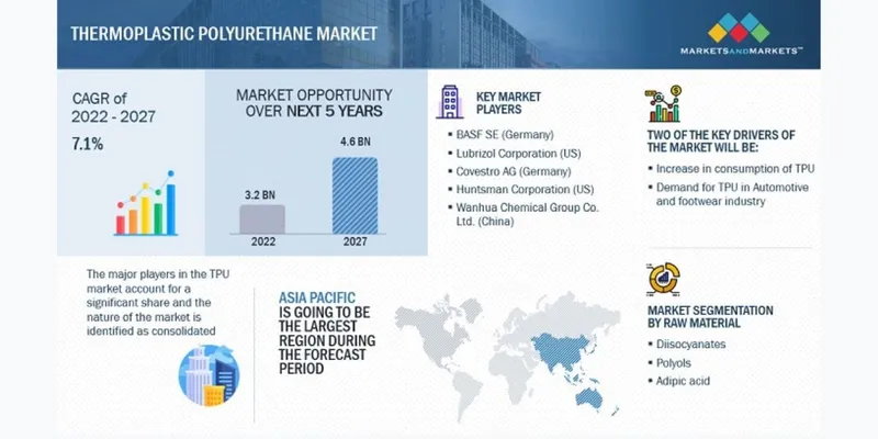 The report "Thermoplastic Polyurethane (TPU) Market Raw Material (Diisocyanates, Polyols, Diols), Type (Polyester, Polyether, Polycaprolactone), End-Use Industry (Footwear, Industrial, Machinery, Automotive, Electronics, Medical), and Region - Global Forecast to 2027", is projected to reach USD 4.6 billion by 2027, at a CAGR of 7.1% from USD 3.2 billion in 2022. The TPU market is mainly driven by the demand for TPU in various end-use industries, including automotive, medical, industrial machinery, footwear, and electronics, coupled with the replacement of conventional materials with TPU. Moreover, it is also driven by rapidly developing and emerging economies such as India, China, and Taiwan. Download PDF Brochure Browse • 272 Market data Tables • 45 Figures • 242 Pages and in-depth TOC on "Thermoplastic Polyurethane (TPU) Market - Global Forecast to 2027" Some of the prominent key players are: · BASF SE (Germany) · Lubrizol Corporation (US) · Covestro AG (Germany) · Huntsman Corporation (US) · Wanhua Industrial Group (China) · COIM Group (Italy) · American Polyfilm Inc (US) · Kuraray Co., Ltd (Japan) · PolyOne Corporation (US) Opportunity: Substitute for PVC in medical applications The medical industry offers significant opportunities for TPU manufacturers. TPU is used in various medical applications such as catheters, medical devices, orthodontic products, and wound care products. Safety and comfort are the priorities when selecting materials to form medical products, as some of the medical products are inserted into the human body. Therefore, materials consisting of patient-friendly factors such as flexibility and biocompatibility are considered. TPU possesses good chemical and mechanical characteristics and biocompatibility, which are of prime importance in medical applications. TPU has superior properties in terms of resistance to wear, low temperature, oil, chemical, and resilience than PVC. TPU is highly responsive to temperature, as it can be rigid when inserted and flexible once inside the body. These properties have increased the use of TPU in medical applications. Polycaprolactone is projected to be the fastest growing type in the TPU market, in terms of value. Polycaprolactone provides superior mechanical and physical properties, including high tensile strength, excellent elasticity, and resistance to oil and chemicals. Polycaprolactone-based TPU has a lower melting point and can be easily processed, making them ideal for a wide range of applications, such as medical devices, automotive parts, and coatings. Request Sample Pages Asia Pacific is expected to be the fastest growing market for TPU during the forecast period, in terms of value and volume The markets of the Asia Pacific and South America are registering high growth, and the trend is projected to continue during the forecast period. Emerging economies such as India, China, South Korea, Brazil, and Argentina are investing in various industrial developments that are driving the TPU market. Growth in the European market is hindered due to the environmental regulations imposed on the usage of harmful substances, as TPU contains isocyanates. About MarketsandMarkets™