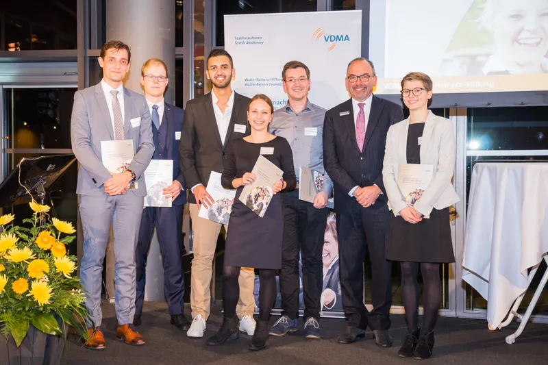 The end of November, the chairman of the Walter Reiners-Stiftung (Foundation) of the VDMA Textile Machinery Association, Peter D. Dornier presented awards to six successful young engineers in Dresden. The award ceremony took place as part of the Aachen-Dresden-Denkendorf International Textile Conference. The focuses of the award-winning works of the young engineers reflect the strengths of German textile machinery construction: the sector is particularly strong where high-quality applications and products are concerned. Janina Elser, TU Chemnitz, Abdelrahman Elbayoumi, ITA Aachen and Hendrik Pötzsch, ITM Dresden, were honoured with creativity awards for the cleverest bachelor or project work. The prizes are endowed with 3,000 euros each. Ms. Elser's bachelor thesis dealt with the prototypical development of circular knitted knee bandages. The subject of Mr. Elbayoumi's bachelor thesis is a feedback control system for an over-braiding process. Mr. Pötzsch's project work deals with the production of carbon fibres using solvent wet spinning technology. Tim Kaluza, ITM Dresden and Julia Eckert, ITA Aachen, were awarded two promotion prizes in the category diploma / master thesis with prize money of 3,500 euros each. Mr. Kaluza's diploma thesis deals with the automated production of mesh-free multiaxial fabrics. In her master thesis, Ms. Eckert developed an environmental assessment system for the production of jeans. This year, the promotion prize of the German Textile Machinery Industry in the dissertation categorywas awarded to Dr. Stefan Heinrich, TU Chemnitz. The prize is endowed with 5,000 euros. The result is a fundamental work on gear requirements in textile machines, which will make a greater contribution in engineering practice. Caption: Chairman of the foundation and the winners (from left to right): Heinrich, Kaluza, Elbayoumi, Elser, Pötzsch, Dornier, Eckert. (Source: ©ITM/TU Dresden).