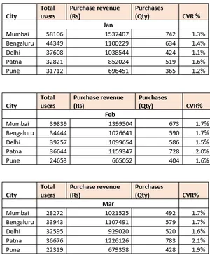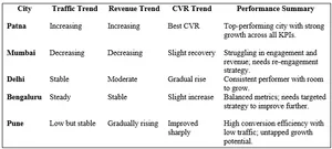 This indicates that while other cities like Patna and Delhi showed growth or stability, Mumbai's revenue consistently declined over the three months, despite an improvement in CVR%. This could be due to a drop in high-value purchases or a shift in consumer behavior in the region.