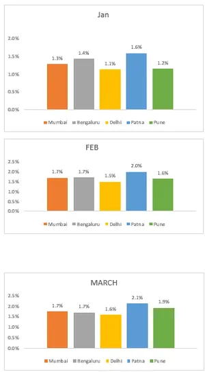 Mumbai-January: ₹15,37,407.34, February: ₹13,99,504.23, March: ₹10,21,525.90, and overall decline of approx. 33.6%.