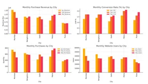 The data gathered was processed with descriptive statistics to capture overall trends and patterns in users' behavior, buying activities, and conversion rates. In particular, Excel was employed to derive monthly totals, detect patterns of growth, and examine the correlation between users' engagement and buying behavior among the five cities. The analysis further entailed computing percentage differences in revenue, quantity purchased, and conversion rates to determine the improvement and decrease over the period of three months.