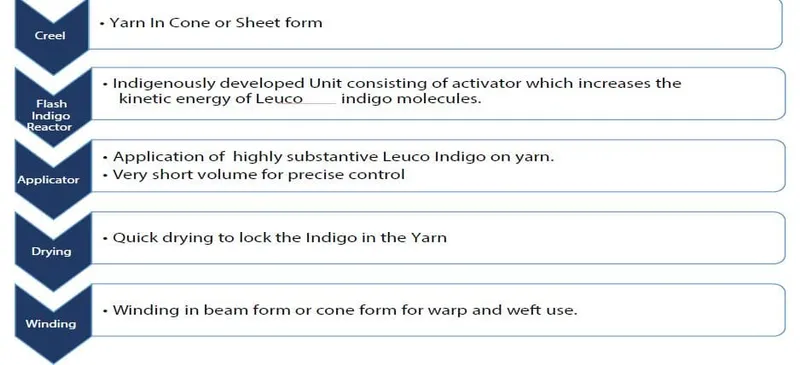 The main aim of using the ultra-rapid indigo dyeing technology is to achieve sustainability by reducing water usage, using less energy and less harmful chemicals in getting the regular Indigo dyed yarn as per the conventional process.