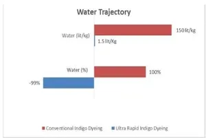 Water trajectory – Approximately 150 litres of water per kg fabric is utilised in a typical indigo dyeing process [9]. By using the Ultra Rapid Indigo Dyeing technology this utilisation can be brought to 2 litres of water per kg of yarn i.e. in corresponding fabric this will translate to 1 litre per kg of denim fabric where warp is indigo dyed and weft is plain white. This technology enables to use only approx. 1% of water compared with conventional indigo dyeing process. Since all the dye liquor being consumed and reused there is no effluent generated at source. Hence, saving in treatment of wastewater, saving in energy, and savings in raw material and chemicals in indigo dyeing and subsequent process.