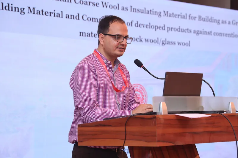 Shri. Shishir Tyagi, Addl. Joint Director, WRA, presented the CWDB’s sponsored research and development project on utilising Indian coarse wool as a sustainable insulation material for green buildings. The presentation highlighted the scientific validation of wool-based nonwoven insulation panels, demonstrating comparable thermal conductivity and strong acoustic performance against conventional materials like rock wool. He emphasised wool’s natural advantages, such as biodegradability, moisture regulation, fire resistance and improved indoor air quality, while also showcasing successful prototype testing under real climatic conditions at the Kutch region.