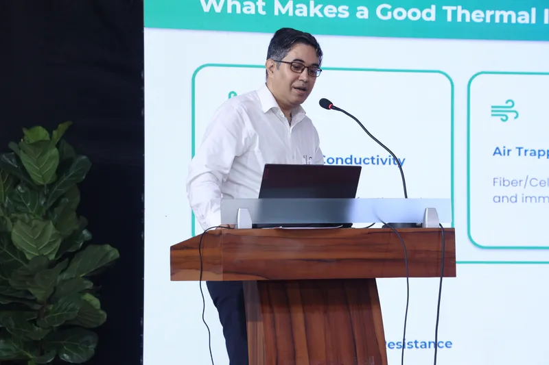 Shri. Mohak Zanwar, Associate Director, Environmental Design Solutions (EDS) presented the role of natural wool as a sustainable insulation material in modern building design. He explained how wool contributes to energy efficiency, thermal comfort and reduced operational costs while maintaining low embodied carbon and environmental impact. The presentation compared wool with conventional materials, highlighting its superior moisture control, durability and non-toxic nature, making it suitable for green certifications such as LEED and WELL. He also emphasised its lifecycle benefits from renewable sourcing to biodegradable end-of-life.