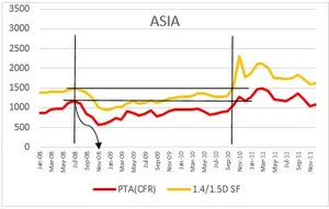In Europe, declined in polyester chain also began in July 2008 with PTA and PSF prices began to fall. They kept falling until January-February 2009, taking a longer time than Asia of about 24 weeks. After touching the low, they gathered upward momentum but hovered below the July levels until January 2011, taking almost 31 months. In 2008, Europe accounted for less than 5% of both global PSF capacity and supply.