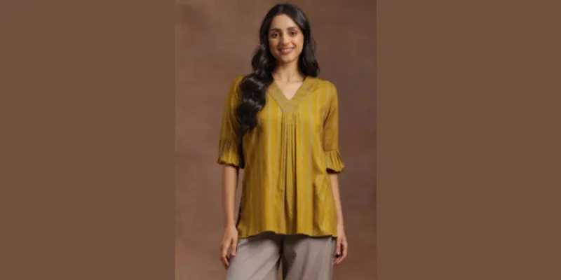 The choice of colours and patterns for workwear plays a crucial role in making the appropriate professional impression. Solid colours have always been a safe choice for workwear tops for women. Hues like ivory, navy, black, burgundy, sap green and muted earthy shades are the best picks to create a polished and work-appropriate look. You can pair short tops and tunics in these colour palettes with high-waist trousers and skirts. If you’re in the mood to experiment, you may also opt for ultramarine, emerald, green and fuchsia colours for your workwear wardrobe.